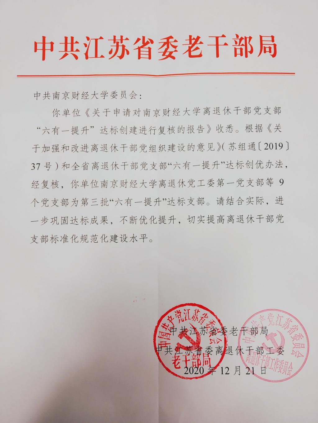据悉,全省离退休干部党支部“六有一提升”工程,被列为全省党建创新重点项目之一,旨在提升离退休干部党组织的组织力,提高离退休干部党支部标准化规范化建设水平。2020年4月,中共江苏省委老干部局、中共江苏省委离退休干部工作委员会下发《关于统筹做好第二第三批离退休干部党支部“六有一提升”达标验收工作的通知》(苏委老干工委〔2020〕2号),要求“2020年底前基本实现全省离退休干部党支部‘六有一提升’全覆盖”。