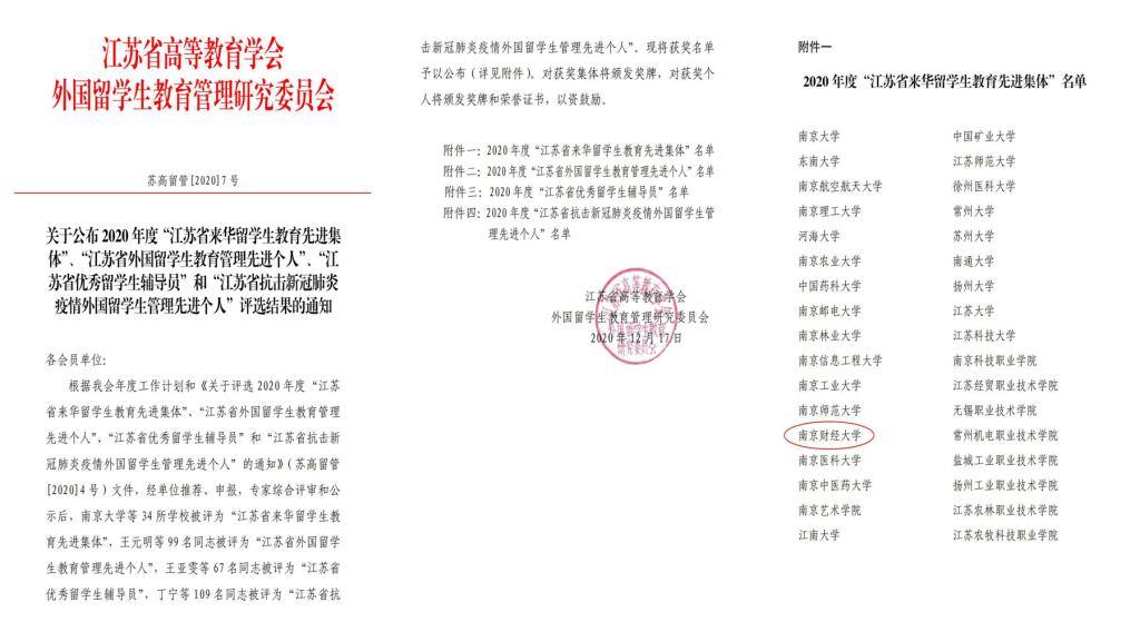 近日,江苏省高等教育学会外国留学生教育管理研究委员会公布2020年度“江苏省来华留学生教育先进集体”评选结果(苏高留管〔2020〕7号),bat365获评“江苏省来华留学生教育先进集体”。