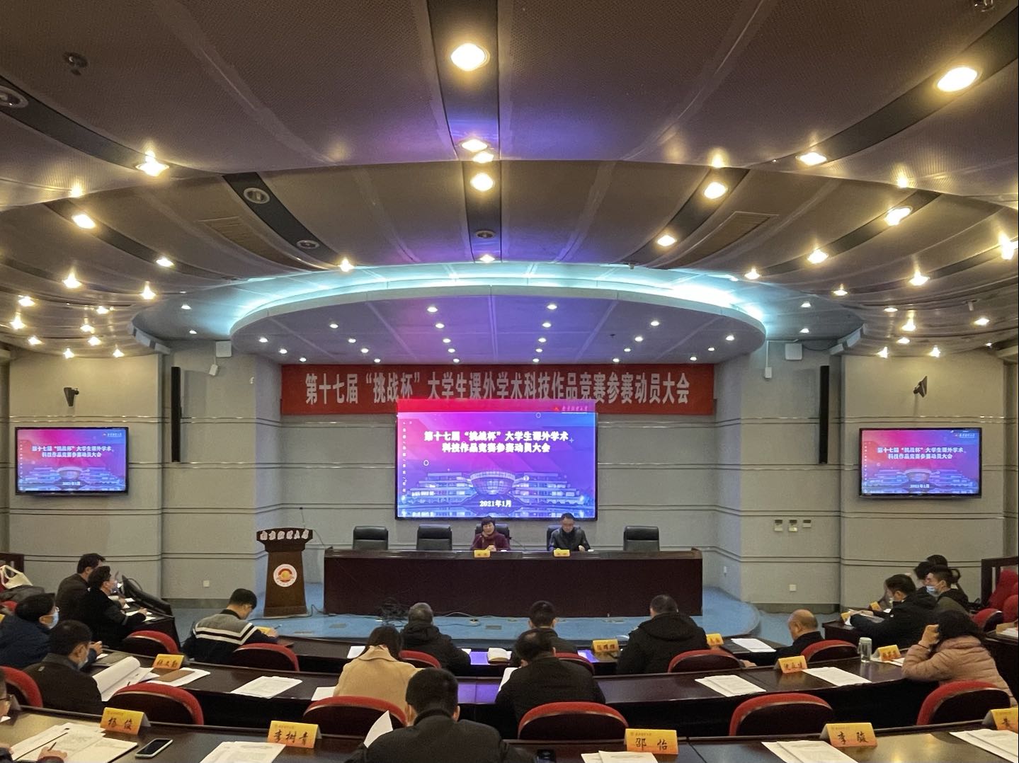 1月20日下午,bat365在仙林校区行政楼二楼报告厅举办第十七届“挑战杯”大学生课外学术科技作品竞赛参赛动员大会。校党委常委、副校长时现,各学院分管教学工作副院长,部分项目指导老师以及校团委全体工作人员参加会议。会议由校团委书记徐刚主持。