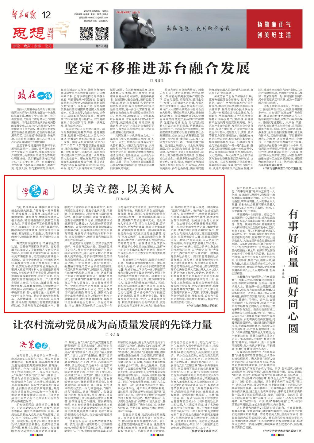 2月23日,《新华日报》思想周刊刊发了校长程永波的署名文章《以美立德 以美树人》。