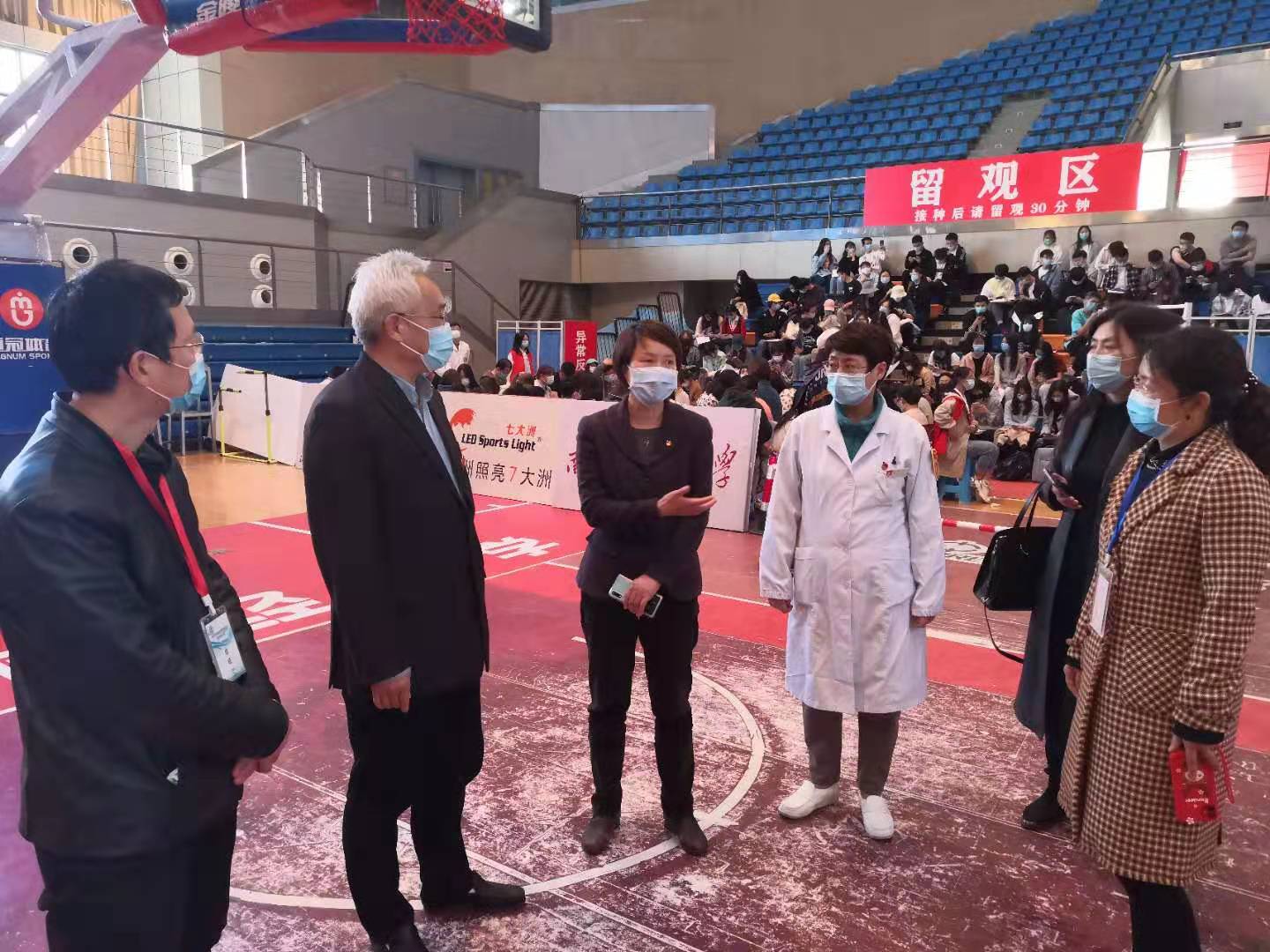 为响应省委、省卫健委号召,4月13日,bat365首批师生新冠肺炎疫苗接种工作在仙林校区体育馆正式启动。栖霞区副区长卢静,校疫情防控领导小组组长、副校长李群、张为付到现场指导疫苗接种工作。