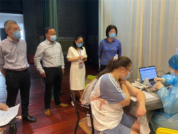 邱伟芬副校长认真查看了登记、等候、接种、留观、应急处置等区域场所,详细了解福建路校区学生疫苗接种工作进展,对疫苗接种工作的有序开展给予了充分肯定,并对一线医务工作者致以亲切问候。