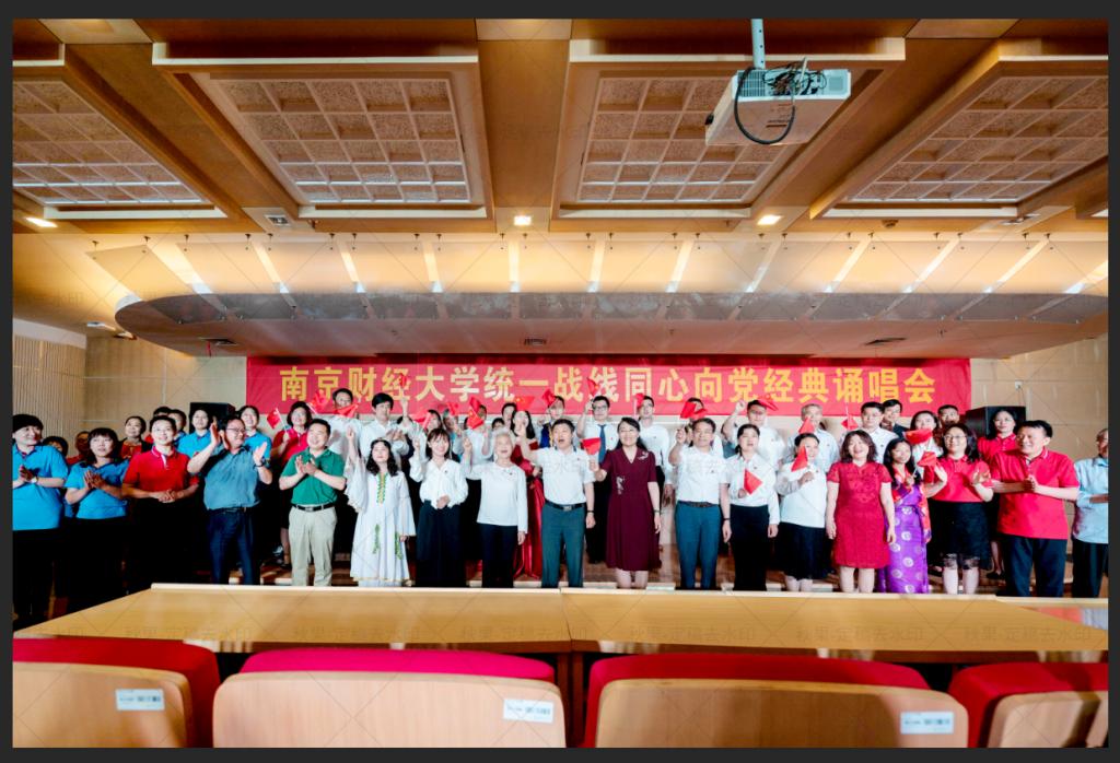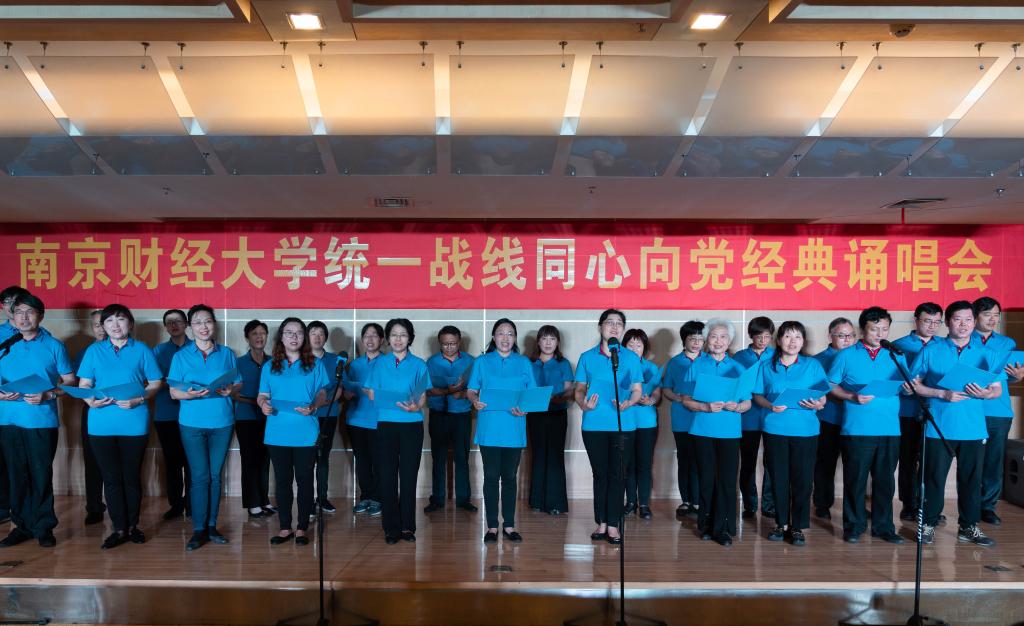 一首饱含深情的《把一切献给党》拉开了经典颂唱会的序幕,唱出了一代又一代人的心声;铿锵有力的诗朗诵《沁园春·雪》带领大家领略了伟人毛泽东的豪情壮志及伟大胸怀;“唱支山歌给党听,我把党来比母亲;母亲只生了我的身,党的光辉照我心”,伴随着《唱支山歌给党听》那脍炙人口的旋律,台下很多观众都不由自主地跟着哼唱,抒发对党的无限感激之情;由80岁民盟盟员马承霈老师带来的独唱《你是灯塔》,唱出了老一辈人的爱国爱党情怀;外国语学院的合唱《国家》响彻全场,表达出南财人奋进新时代的担当与壮志;一首感人至深的经典诗歌朗诵《我的祖国》,令现场观众无不为之动容……终曲大合唱《没有共产党就没有新中国》将诵唱会现场推向高潮,全场起立共同高歌,激昂的旋律让人心潮澎湃,唱响了新时代的爱国情、报国志。