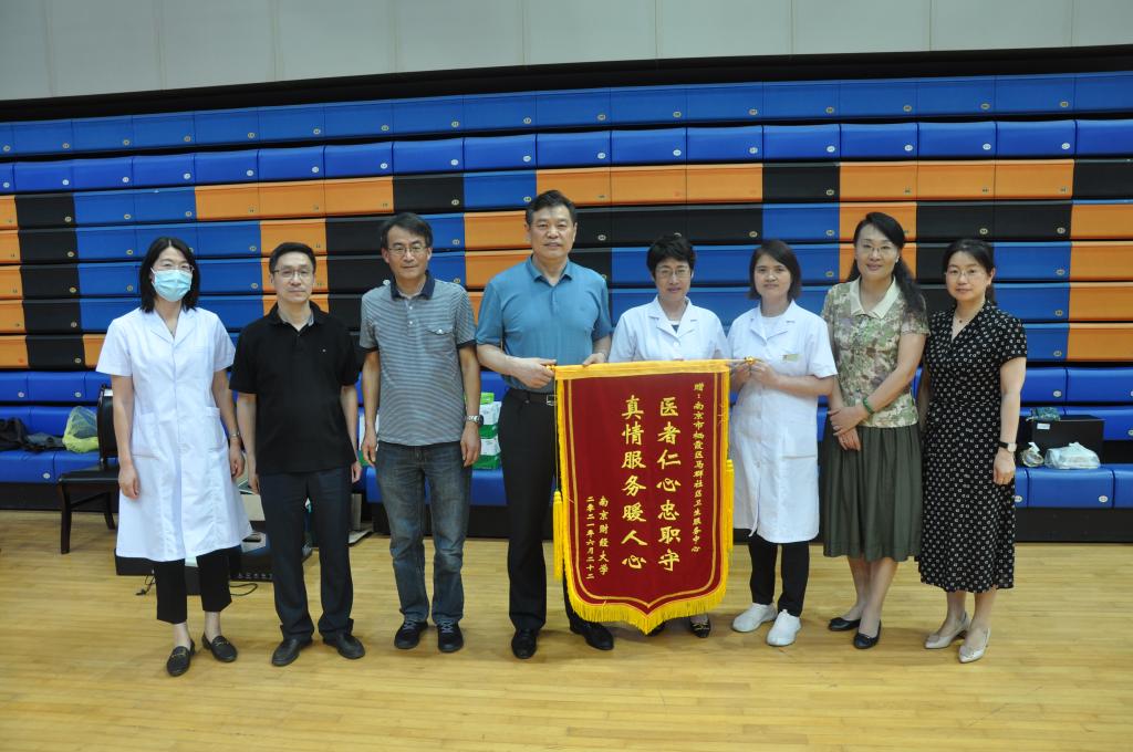 接种结束之际,党委副书记(正校级)温潘亚,党委常委、副校长李群,党委常委、统战部部长吕戎来到接种现场,代表学校向栖霞区马群社区卫生服务中心郑重献上一面写着“医者仁心忠职守,真情服务暖人心”的锦旗,对医护人员在bat365新冠疫苗接种工作中提供的细致服务表示诚挚感谢和崇高敬意。