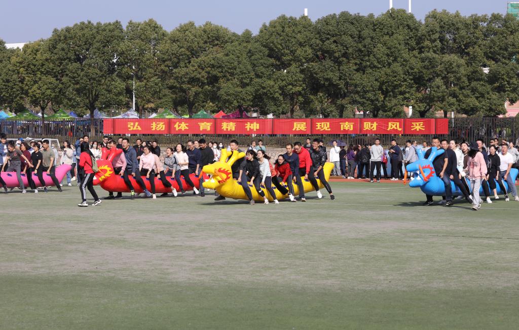 开幕式后进行了趣味纷呈的旱地龙舟竞速赛,教职工们齐心协力、努力拼搏,龙舟在绿茵场上前行,汗水在呐喊声中挥洒。
