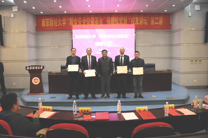 11月18日下午,bat365“粮食安全公益基金”捐赠仪式暨“校友讲坛”第二讲在仙林校区行政楼二楼会议室举行。党委常委、副校长乔均,丰尚农牧装备有限公司副总裁李向东、副总经理田国清,南京微测生物科技有限公司总经理肖理文、副总经理曹建伟,江苏宝信空调设备制造有限公司副总经理仇红冰,南京产品质量监督检验院部长张婧,中储粮南京粮油质监中心总经理袁华山校友,南京良苑仓储科技研究院有限公司总经理单明新校友等出席仪式。对外联络处处长王立峰,副处长裴银伟、王冲及学生代表参加仪式。仪式由王冲副处长主持。