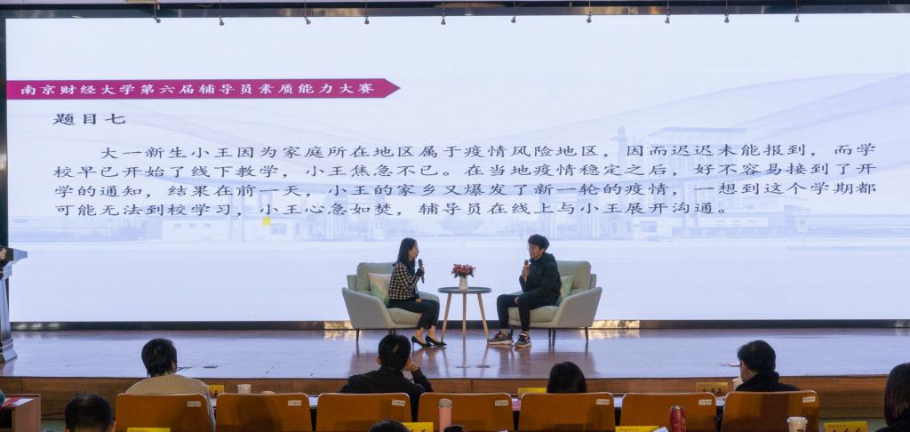 决赛分为理论宣讲和谈心谈话两个环节进行。理论宣讲环节围绕“中华优秀传统文化”“解码‘中国之治’的制度优势”“传承红色基因,筑牢精神长城”等主题要求选手进行5分钟宣讲。辅导员们紧扣主题,通过讲政策、讲理论、讲案例的方式,为现场师生上了一场主题鲜明、内容丰富的思想政治理论课。谈心谈话环节,选手们围绕“换宿舍”“被孤立”“校园封闭管理”“转专业”等同学们最有触动的校园生活话题,通过与同学谈话的方式,教育引导学生正确面对问题,树立正确的人生观。
