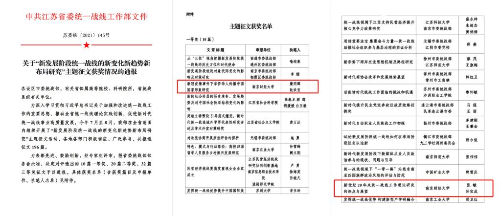 为深入学习贯彻习近平总书记关于加强和改进统一战线工作的重要思想,推动全省统一战线理论实践创新,促进新时代统一战线事业高质量发展,今年7月,省委统战部在全省范围内组织开展“新发展阶段统一战线的新变化新趋势新布局研究”主题征文活动。经个人申报、校内初评、择优推荐,bat365推荐的论文从全省196篇征文中脱颖而出,其中工商管理学院廉同辉副教授的论文《新冠肺炎疫情事件下华侨华人传播中国国家形象研究》获得一等奖,营销与物流管理学院张敏教授的论文《新世纪20年来统一战线工作理论研究的热点与展望》获得二等奖。