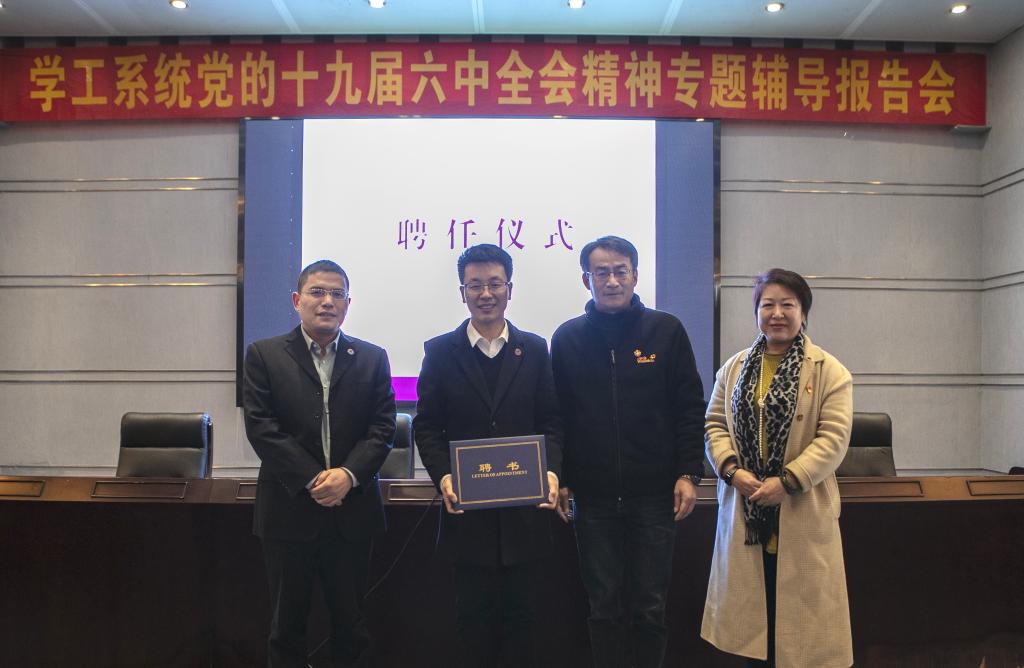 12月16日上午,学工系统党的十九届六中全会精神专题辅导报告会在仙林校区行政楼二楼报告厅召开。党的十九大代表、南京航空航天大学马克思主义学院党委书记徐川教授应邀作宣讲报告。党委常委、副校长李群出席会议并为徐川教授颁发客座教授聘书。马克思主义学院党总支书记陈翔,各学院党委(党总支)副书记,全体辅导员及马克思主义学院师生代表、学工部、研工部全体人员参加报告会。报告会由党委学生工作部部长韩力争主持。
