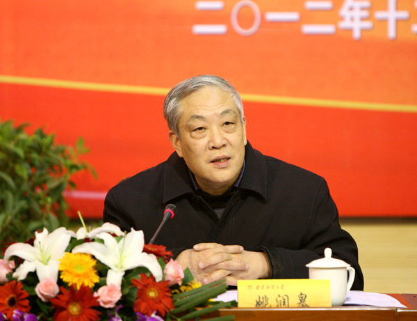 报告中,姚润皋教授围绕党的十八大的重大意义和鲜明主题,党的十八大报告提出的新思想、新观点、新举措,科学发展观的历史地位和指导意义,全面建成小康社会和全面深化改革开放的目标任务,社会主义经济、政治、文化、社会、生态文明建设的重大部署和重大举措,提高党的建设科学化水平等进行了系统而全面的阐释。姚润皋教授特别强调了党的十八大报告中的两大理论创新:一是对科学发展观进行了科学定位。将科学发展观和邓小平理论、三个代表重要思想共同作为党的指导思想;二是丰富了中国特色社会主义内涵。中国特色社会主义是当代中国发展进步的旗帜,也是全党全国各族人民团结奋斗的旗帜,这面旗帜具有鲜明的实践特色、理论特色、民族特色、时代特色。就党的十八大报告中提到的坚持教育优先发展,姚润皋教授认为,立德树人是教育的根本任务,教师在教学过程中应注重培养学生的社会责任感、创新精神、实践能力,将学生培养为德智体美全面发展的社会主义建设者和接班人;同时,还要加强师德建设,增强教师教书育人的荣誉感和责任感,将教书育人的理念渗透到教学的各个环节中。姚润皋教授强调,党的十八大报告对广大青年提出了殷切希望,希望当代青年做到永远热爱我们伟大的祖国,永远热爱我们伟大的人民,永远热爱我们伟大的中华民族,在投身中国特色社会主义伟大事业中,让青春焕发出绚丽的光彩。党的十八大报告是今后五年全党、全国人民必须遵循的行动纲领,对能否完成现阶段的目标和任务乃至实现中华民族的伟大复兴都具有极其重大的现实意义和深远的历史意义。我们应当用党的十八大精神凝聚力量,统一意识,将智慧和力量奉献给中国特色社会主义的伟大事业。