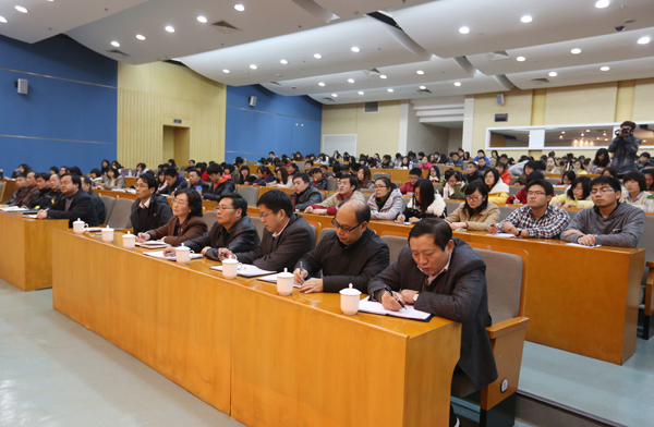 12月5日下午,省委宣讲团党的十八大精神报告会在bat365仙林校区图书馆报告厅隆重举行,省委宣讲团成员、江苏省高校思想政治理论课教学指导委员会主任委员、南京大学哲学系博士生导师姚润皋教授作党的十八大精神报告。校领导陈章龙、王建明、王开田、许承明、程光熙、胡建渊,各学院党总支书记、党支部书记、研究生党员、本科生党员认真聆听了报告。报告会由校党委书记陈章龙主持。