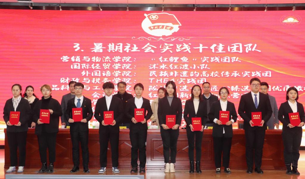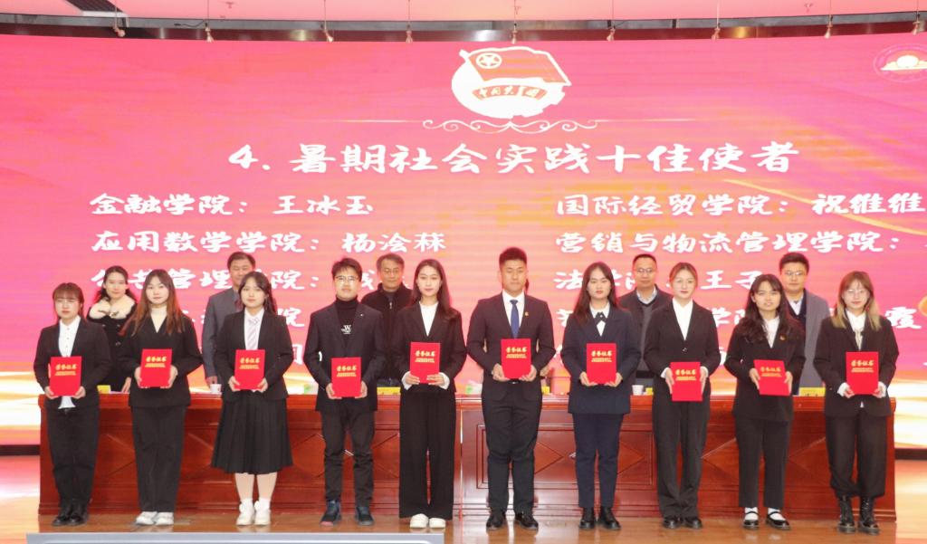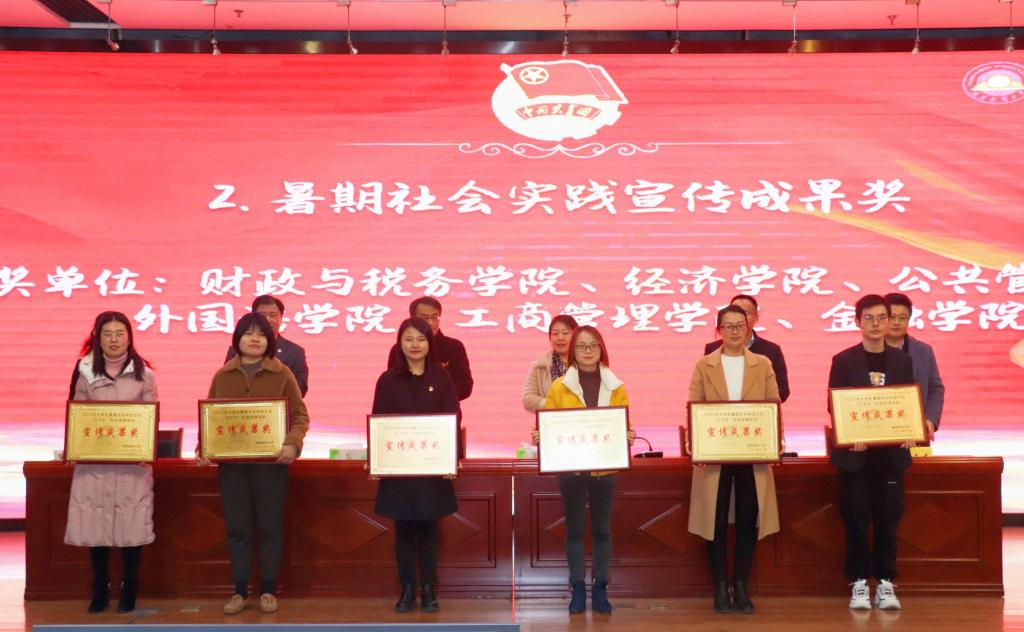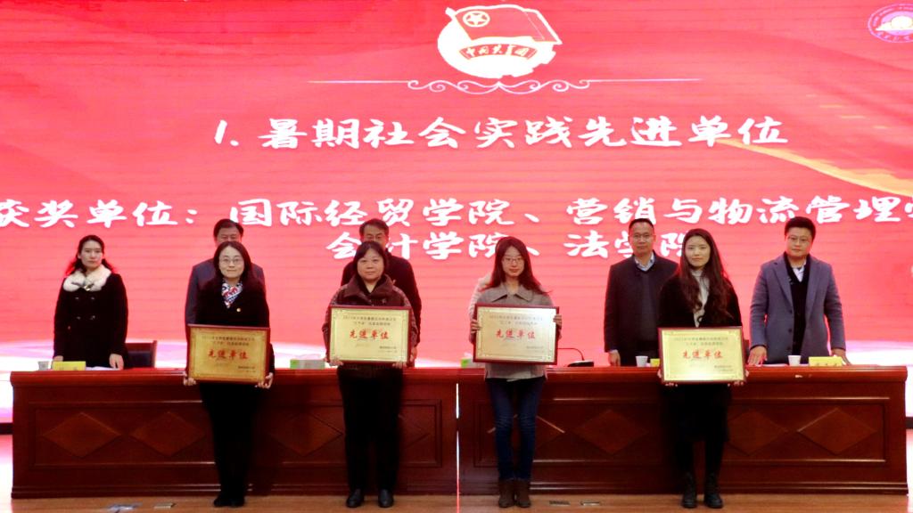 国际经贸学院、营销与物流管理学院、会计学院、法学院获校“暑期社会实践先进单位”;财政与税务学院、经济学院、公共管理学院、外国语学院、工商管理学院、金融学院获校“暑期社会实践优秀宣传成果奖”;营销与物流管理学院“红鲤鱼”实践团队等10支团队获校“十佳团队”;金融学院投资1901班王冰玉等10名同学获校“十佳使者”。