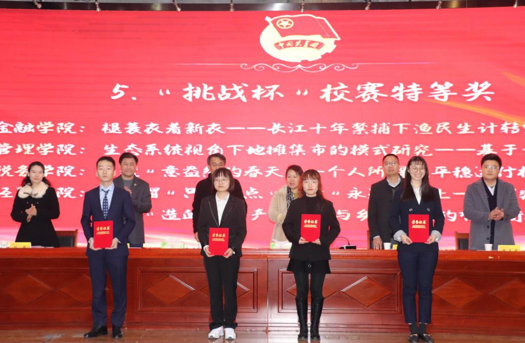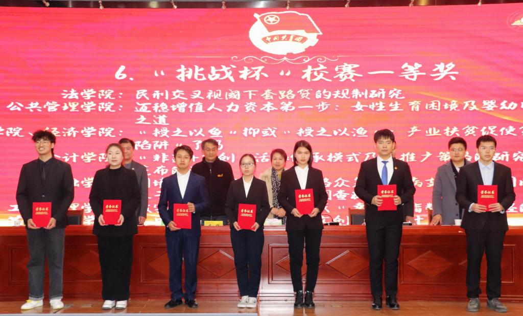 金融学院《褪蓑衣着新衣——长江十年禁捕下渔民生计转型及其政策支持研究》等4个作品获“挑战杯”校赛特等奖;法学院《民刑交叉视阈下套路贷的规制研究》等7个作品获“挑战杯”校赛一等奖;莫媛、万兴、程瑶、杨继军、娄永涛、汪润泉等11位教师获“挑战杯”优秀指导教师。