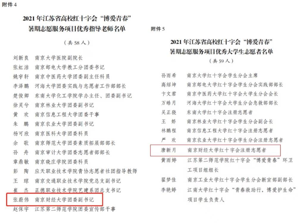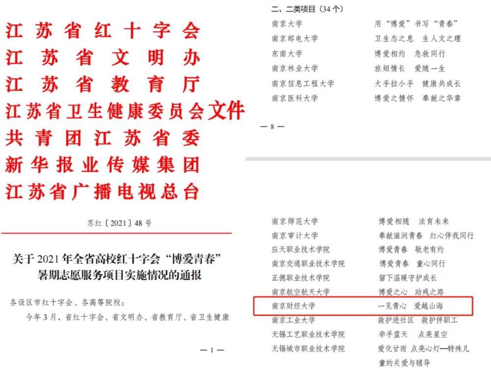 近日,江苏省红十字会等多部门联合开展的2021年江苏省高校红十字会“博爱青春”暑期志愿服务项目展示总结活动中,bat365《一见青心,爱越山海》项目脱颖而出,入选省级支持项目,校团委副书记张蔚伟获评“优秀指导老师”,国贸2001班唐新月同学获评“优秀大学生志愿者”。