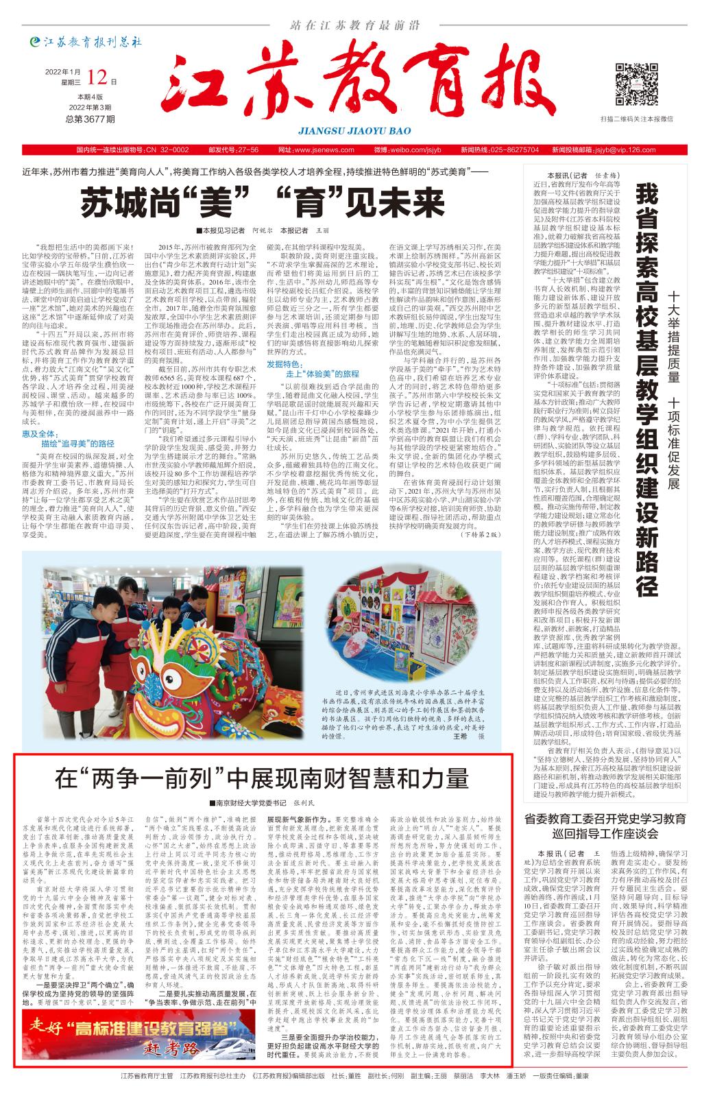 1月12日,《江苏教育报》头版“走好‘高标准建设教育强省’赶考路”专栏刊发了校党委书记张利民的署名文章《在“两争一前列”中展现南财智慧和力量》。