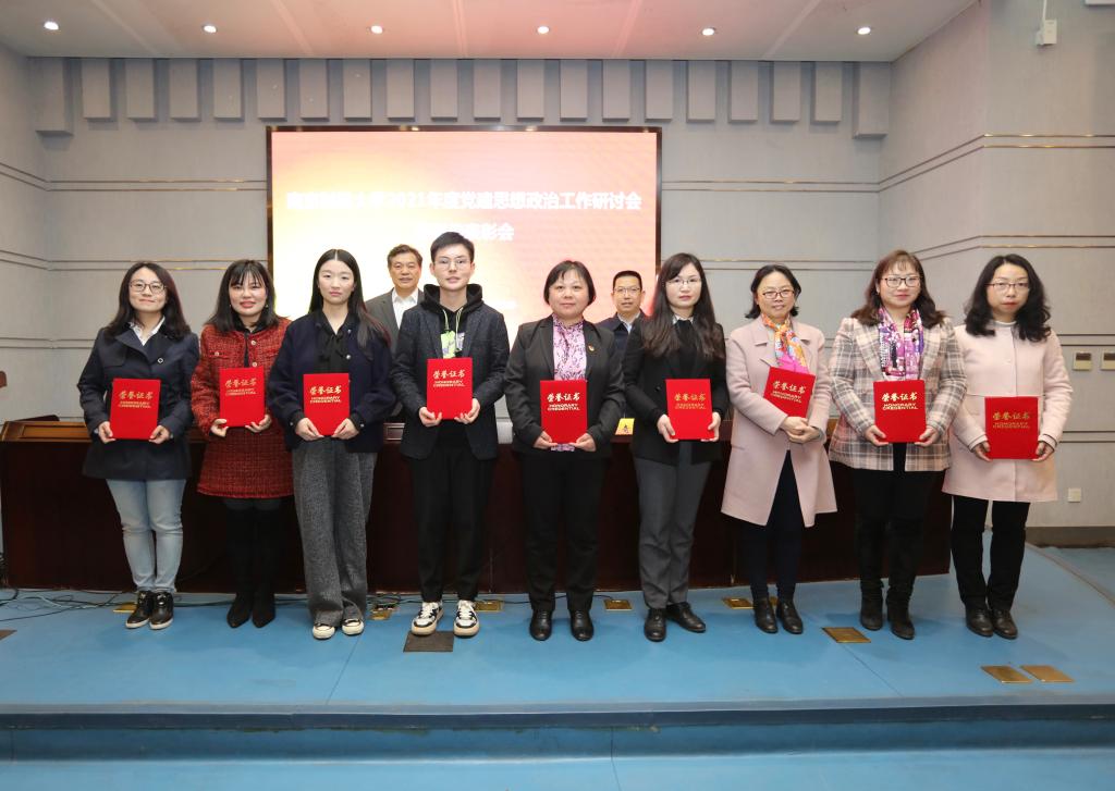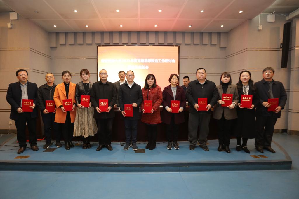 会上,石奇部长通报了2021年度党建思想政治工作课题研究立项、结题情况,2021年度思政精品立项情况,以及2021年度思想政治工作、新闻宣传工作开展情况。党委宣传部副部长陈丹宣读了2021年度“优秀新闻宣传单位”“优秀宣传员”“优秀通讯员”名单。党委宣传部副部长秦韶华通报了2021年度党建思想政治工作研讨会论文征集情况,宣布了论文获奖名单。现场举行了颁奖仪式。