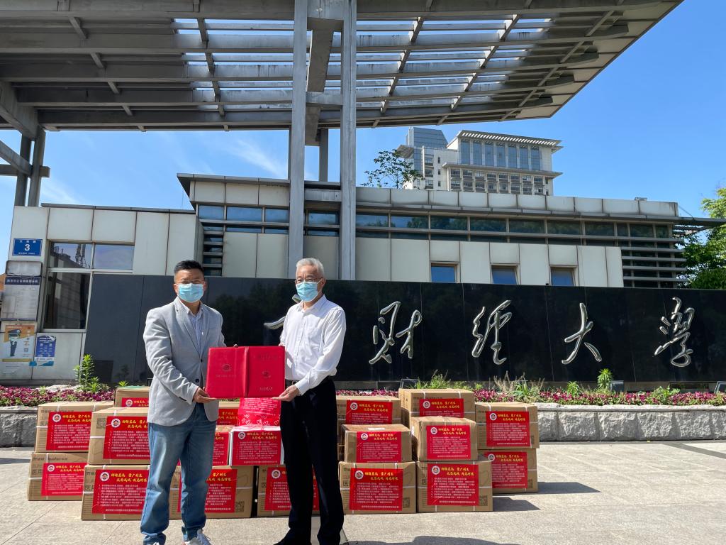 营销与物流管理学院领导代表学院接受捐赠,张为付副校长代表学校向校友们颁发捐赠证书。
