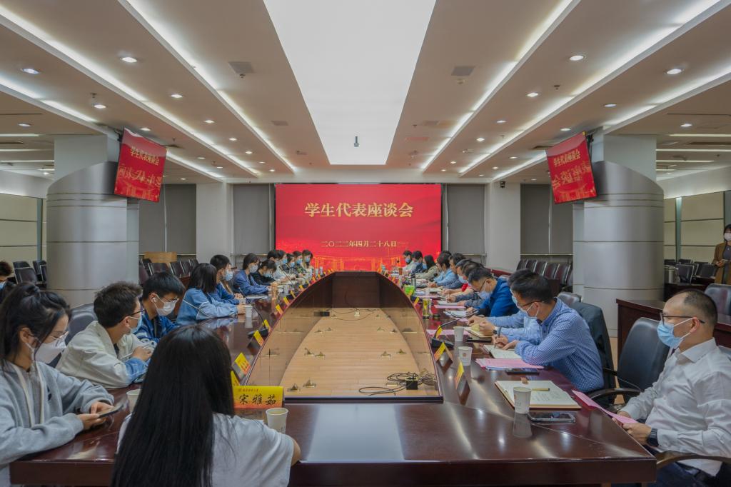 4月28日下午,bat365在仙林校区行政楼16楼会议室召开学生代表座谈会。校党委副书记(正校级)温潘亚出席会议,党委学生工作部、党委研究生工作部、教务处、保卫处、团委、后勤基建处等部门负责人及20名学生代表参加座谈,座谈会由党委学生工作部部长韩力争主持。