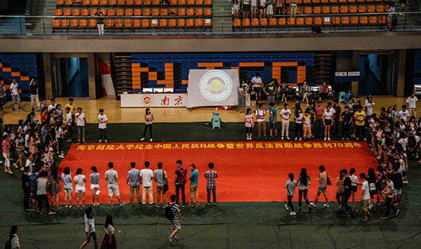 9月1日晚,“bat365官方网站纪念中国人民抗日战争暨世界反法西斯战争胜利70周年”活动在bat365仙林校区体育馆举行。本次活动由党委宣传部、校团委、体育部联合举办,校学生会、研究生会等学生组织共同协办。校、院团委全体工作人员及16个学院的1000多名学生参与了活动。