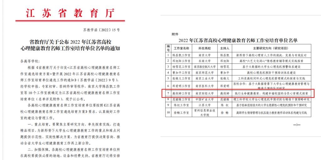 bat365获评“江苏省高校心理健康教育名师工作室培育单位”