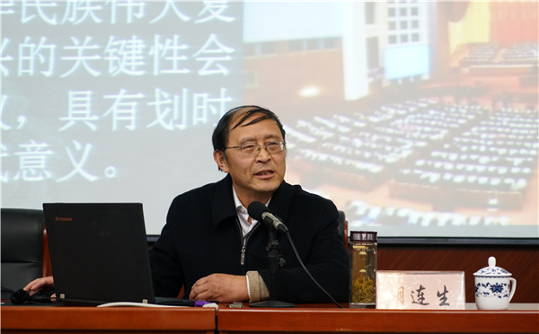 胡连生教授从新论断、新思想、新目标、新举措等方面全面系统地阐述了习近平新时代中国特色社会主义思想和党的十九大精神的精髓核心要义。他指出,党的十九大报告在一系列问题上作出了理论创新,是一篇纲领性、具有划时代意义的马克思主义理论文献,从理论和实践结合上系统解答了“新时代坚持和发展什么样的中国特色社会主义、怎样坚持和发展中国特色社会主义”这个重大时代课题,为解决人类问题贡献了中国智慧和中国方案。党的十九大针对我国面临的形势和任务,作出了中国特色社会主义进入新时代和我国社会主要矛盾转化的两大新论断,明确了我国新的历史方位和全党今后一个时期的战略重点;将习近平新时代中国特色社会主义思想写入党章,确立了全党、全国各族人民实现中华民族伟大复兴的行动纲领和理论指南;作出了“两步走”“两个阶段”的重大战略部署,明确了全面建成小康社会和建设社会主义现代化强国的战略目标;提出了全面深化改革、全面依法治国、全面从严治党等一系列新举措,开启了新时代中国特色社会主义新征程。