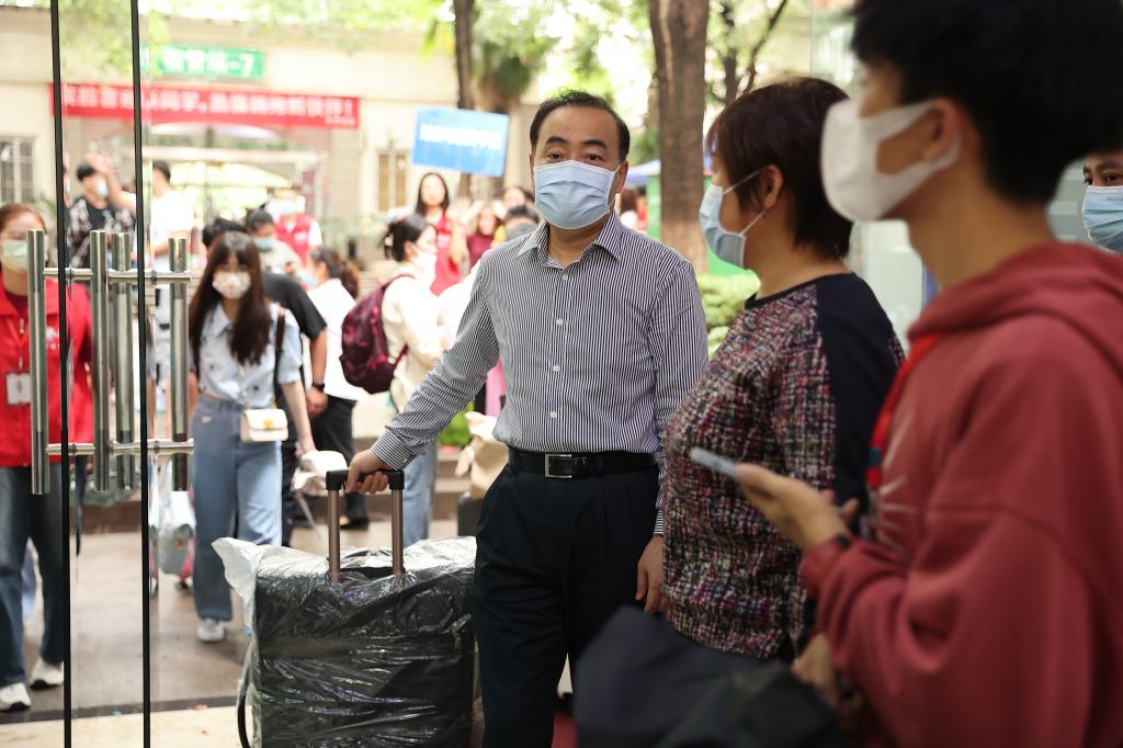 在迎新现场,校领导详细了解新生报到情况,问候工作在迎新一线的师生志愿者们,代表学校感谢大家的辛勤付出,要求全体人员在做好个人防护的前提下,以高度的责任感、满腔的热情、饱满的精神状态,为新生及家长提供全面、热情、周到的服务。校领导对远道而来的新生和家长表示慰问和欢迎,对新生和家长们选择并信任南财表示感谢,仔细询问新生们来校旅程安排、报到过程、所学专业、家庭等情况等,为新生们送上学校最温暖的祝福。校领导表示学校将始终坚持以学生为本的理念,及时解决学生的困难和问题,努力为学生的成长成才提供保障。校领导勉励新生尽快熟悉学校环境,早日适应大学生活,鼓励同学们珍惜大学美好时光,不负青春韶华,志存高远、脚踏实地,用青春与汗水、知识与毅力,书写精彩人生华章。同时,校领导希望新生及家长们支持和配合学校疫情防控各项工作,共同维护新生报到和教育教学秩序及校园安全稳定。