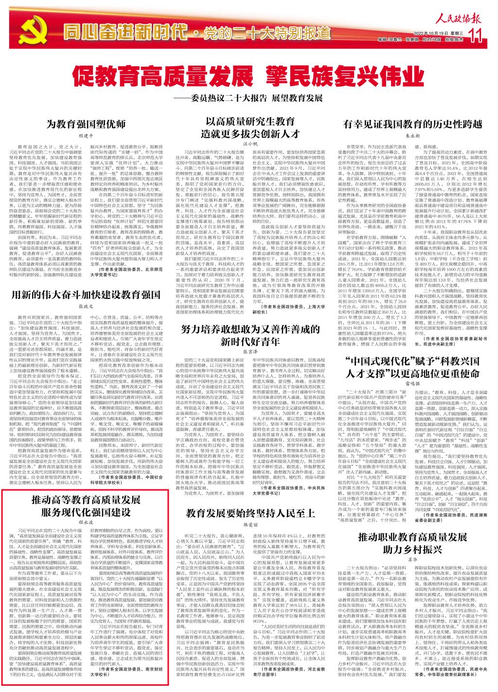 10月19日,《人民政协报》聚焦报道全国政协委员热议党的二十大报告,展望教育发展。文章刊发了全国政协委员、校长程永波学习党的二十大的感想体会。