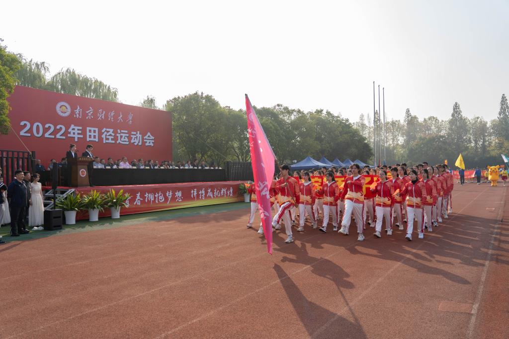 伴随着庄严的国歌声,国旗冉冉升起,庄重整齐的注目礼,彰显着南财学子的爱国热情;和着南财校歌的悠扬旋律,校旗和运动会会旗迎风飘扬,“自谦 自信 务实 超越”的校训精神在心中荡漾。