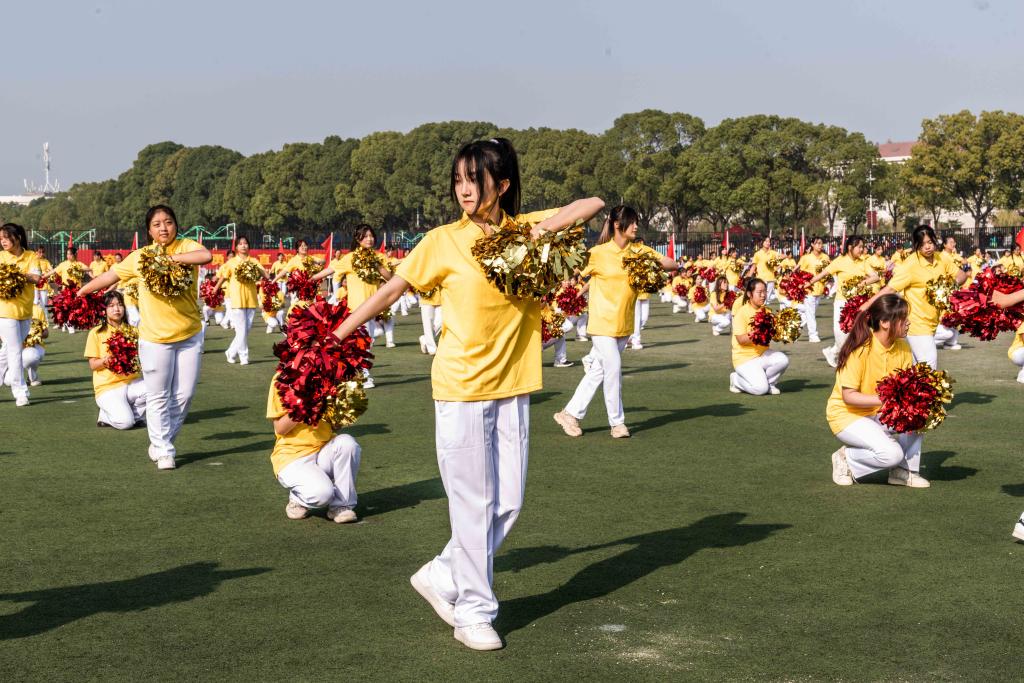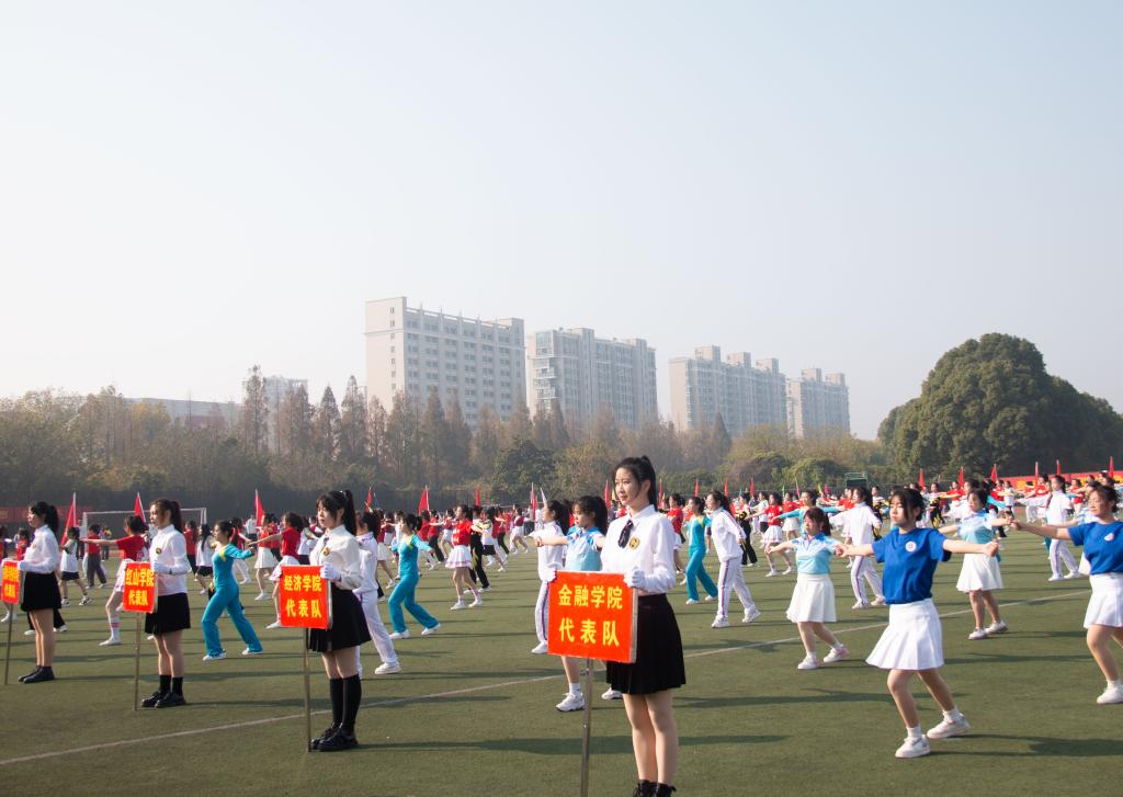 开幕式后进行了广播操和团体操表演。弯腰、踢腿、跳跃、转体……年轻的身体神采飞扬;踏步、击掌、压腿、拉伸……蓬勃的青春尽情绽放。《美丽中国》的旋律响起,团体操表演开始,欢快的节奏,催人奋进;跳动的音符,荡人心弦。阳光下,朝气蓬勃的女孩们手持花球,牵手跳舞,变换的队形,从“NUFE”到“二十”再到“☆”,南财学子以美好青春献礼党的二十大,以无限热情书写爱国情怀。