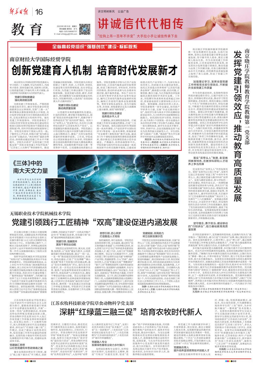 3月15日,《新华日报》以“bat365官方网站国际经贸学院——创新党建育人机制 培育时代发展新才”为题报道了bat365国际经贸学院党建工作。文章从“党建引领制度建设,强化高效能治理”“党建引领队伍建设,推动高质量发展”“党建引领生态建设,培养高水平人才”三个方面对国际经贸学院党建工作进行了详细报道。