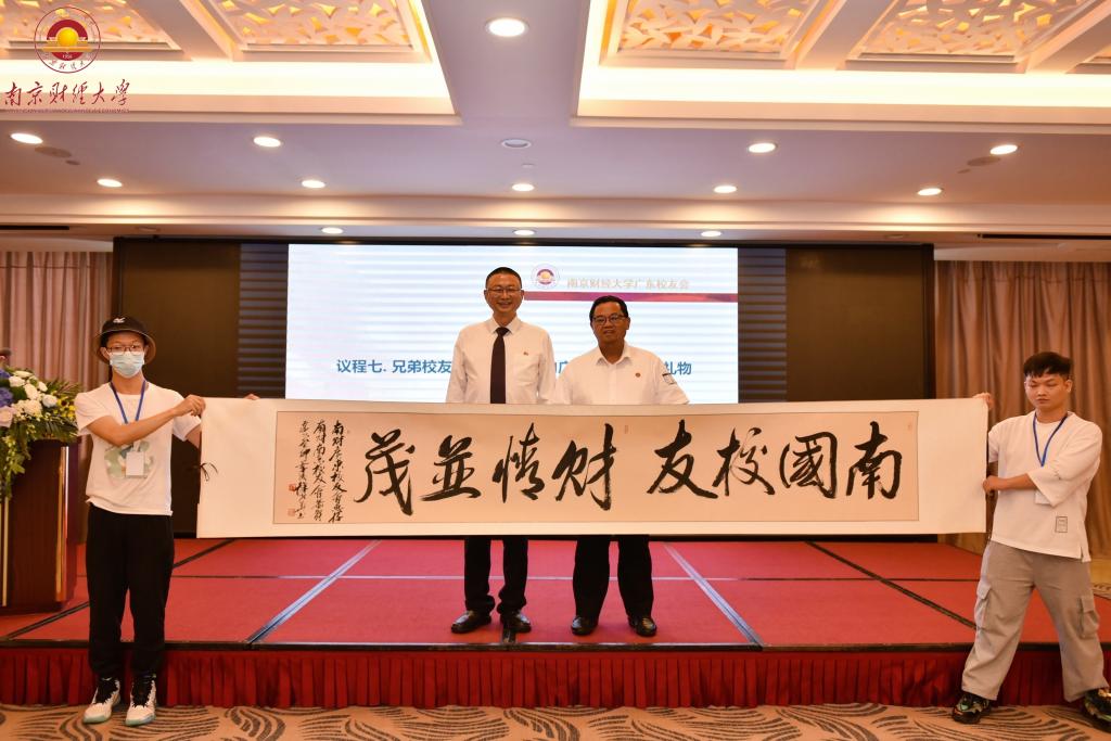 上海校友会会长曹立峰、南京校友会会长张先平先后发言,向广东校友会第三届会员代表大会顺利召开表示祝贺。周业军会长代表广东校友会接受南京校友会赠送的礼物。