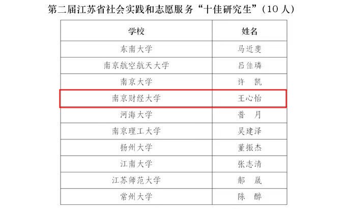 据悉,江苏省社会实践和志愿服务“十佳研究生”“十佳研究生团队”评选旨在全省选树一批具有家国情怀、强国之志和崇高追求的研究生社会实践和志愿服务先进典型,评选经江苏省教育厅批准,由江苏省学位与研究生教育学会与江苏省教育厅教育宣传中心(江苏教育报刊总社)开展,经单位推荐、材料核实、专家推选和综合评议等程序,共选出江苏省社会实践和志愿服务“十佳研究生”10名及“十佳研究生”提名奖10名;江苏省社会实践和志愿服务“十佳研究生团队”10个及“十佳研究生团队”提名奖10个。