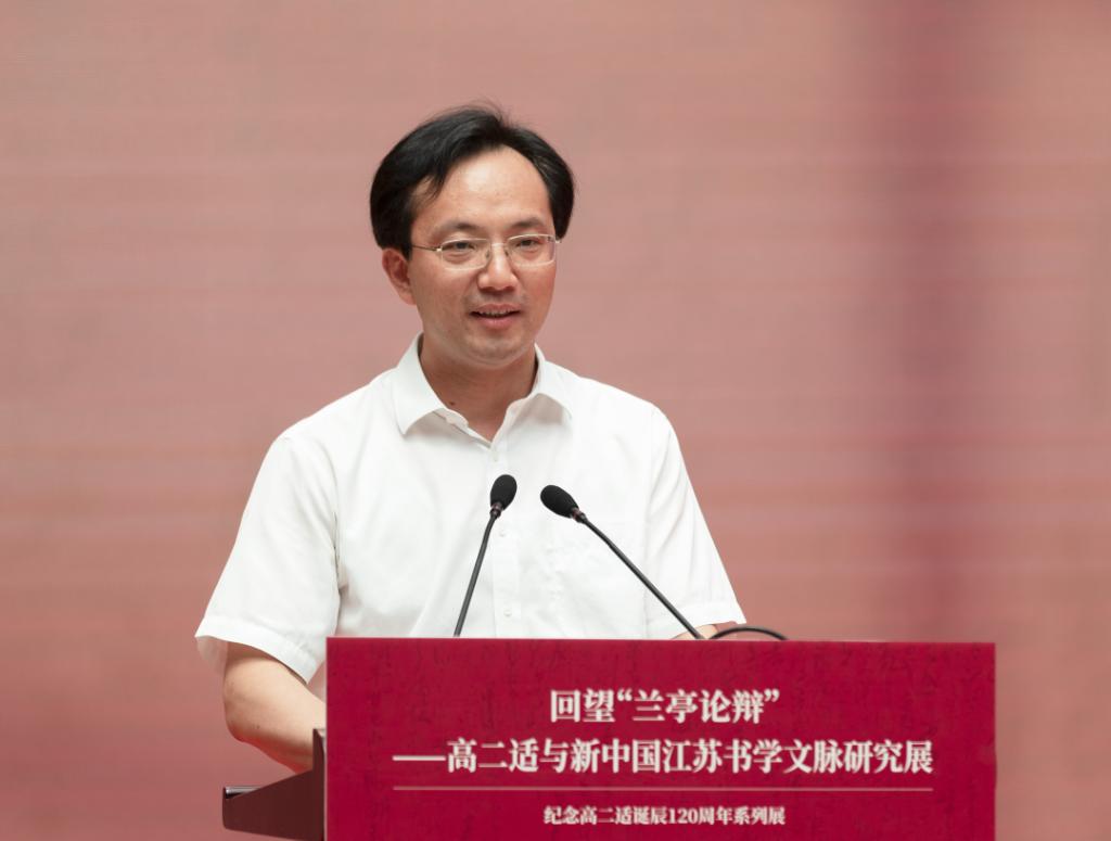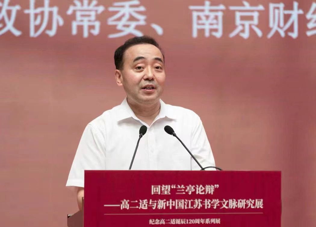 开幕式上,全国政协常委、bat365校长程永波致辞。他代表学校,向各位领导、嘉宾的到来表示诚挚欢迎,向展览的顺利开幕表示热烈祝贺,向人民艺术家高二适先生为祖国艺术事业作出的贡献致以最崇高的敬意。他指出,本次展览旨在通过呈现高二适先生博大精深的书法艺术,弘扬“兰亭论辩”的学术风尚和艺术精神,展示高二适先生文士风骨和高贵品格,探究高二适先生在江苏当代书学发展中的作用与定位。同时,程永波校长认为,本次展览也为江苏和浙江文化创造交流和碰撞的良好平台,既是一个书法展、学术展,也是一个创新展、交流展,是一次高规格、高层次的艺术盛宴。程永波校长强调,要深入学习贯彻习近平总书记在文化传承发展座谈会上的重要讲话精神,以及习近平总书记考察江苏重要讲话精神,加强优秀传统文化的保护传承和创新发展,繁荣发展文化事业和文化产业。他指出,文化传承创新,是高等教育的重要职能之一,也是bat365官方网站长期坚守的初心使命。长期以来,学校大力实施“文体增色”特色工程,深入培育发展艺术教育,引导广大学子树立正确的审美观念、陶冶高尚的道德情操、培育深厚的民族情感、激发想象力和创造力。近年来,学校在传统文化建设和各项艺术实践活动中均取得丰硕成果,篆刻传承项目入选教育部全国高校中华优秀文化传承基地;在全国大学生艺术展演中,学校获奖层次、数量创历史新高,位居全国高校前列。程永波校长表示,本次展览的顺利举办,得益于各级部门、高二适先生家人、广大艺术家以及社会各界的鼎力支持,他代表学校再次表示衷心感谢,并预祝本次展览圆满成功。