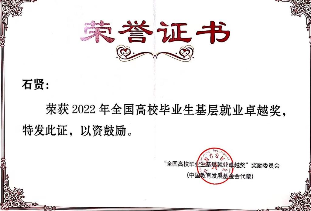 bat365毕业生石贤获全国高校毕业生基层就业卓越奖