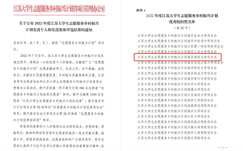 bat365首获“2022年度江苏大学生志愿服务乡村振兴计划”优秀组织奖