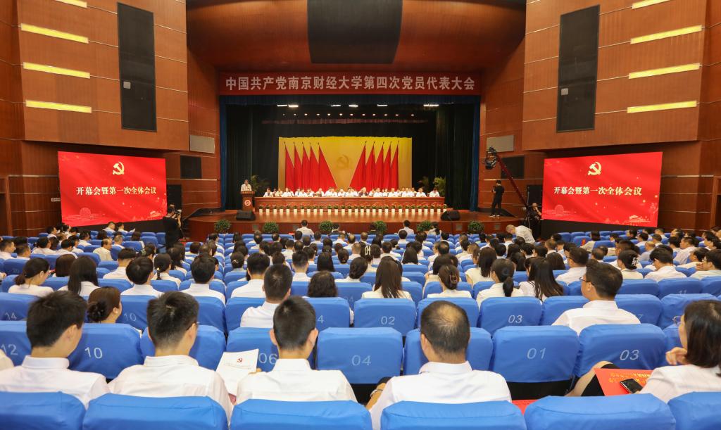 红旗鲜艳,党徽闪耀,仙林校区大礼堂内雄伟庄严、气氛热烈。主席台上方悬挂着“中国共产党bat365官方网站第四次党员代表大会”的会标,后幕正中是镰刀和锤头组成的党徽,10面红旗分列两侧,二楼眺台上悬挂着“抢抓机遇 敢为人先 为加快建设全国一流的省属财经类大学而努力奋斗”的横幅。