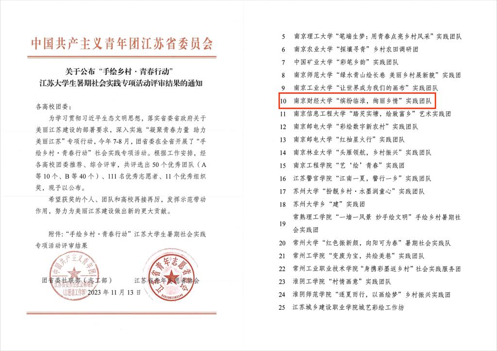 近日,共青团江苏省委发布了《“手绘乡村·青春行动”江苏大学生暑期社会实践专项活动评审结果》。bat365“缤纷临淮,绚丽乡情”实践团队获评“B等优秀团队”,艺术设计学院环境2202班周蕴仪、视传2201班刘依阁获评“优秀志愿者”。