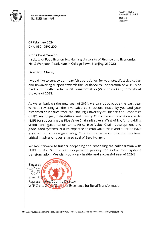 2月5日,联合国世界粮食计划署中国办公室国别代表赵兵向程永波校长发来感谢信,感谢程永波校长对联合国世界粮食计划署中国农村发展卓越中心南南合作项目的坚定奉献和无私支持。