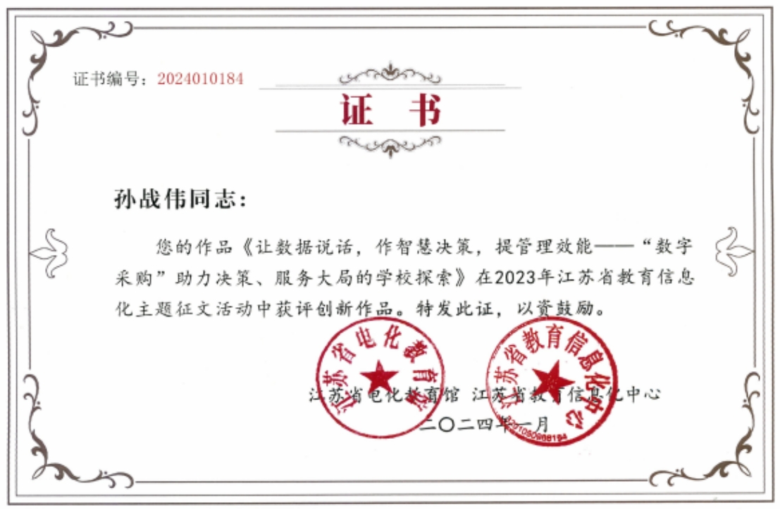 近日,江苏省电化教育馆、江苏省教育信息化中心公布2023年江苏省教育信息化主题征文活动获奖名单。bat365报送的作品《让数据说话,作智慧决策,提管理效能——“数字采购”助力决策、服务大局的学校探索》(完成人:孙战伟)获评创新作品(等同一等奖)。