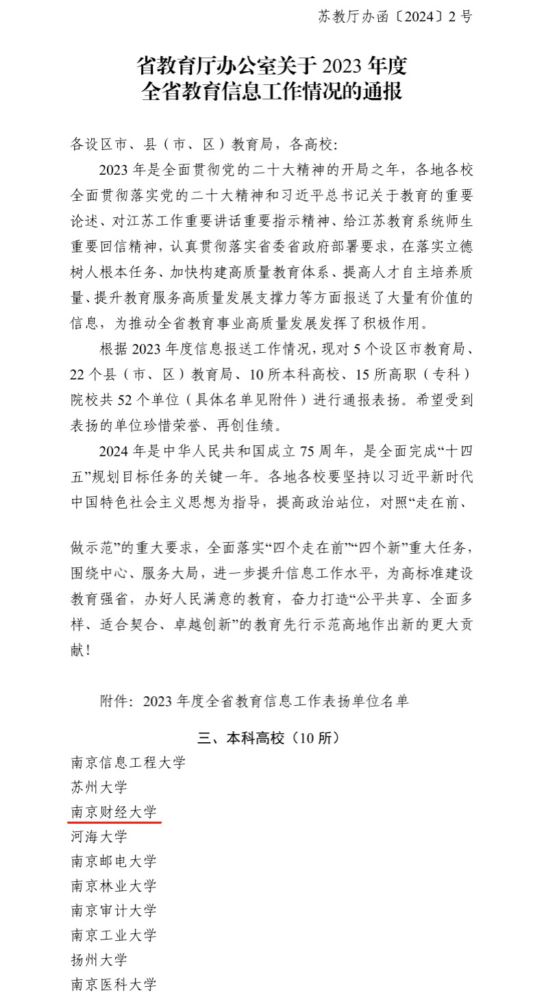 日前,江苏省教育厅办公室公布《关于2023年度全省教育信息工作情况的通报》(苏教厅办函〔2024〕2号),bat365再次获评全省教育信息工作表扬单位,总积分在全省本科高校中排名第3,其中江苏教育网积分在全省本科高校中排名第1,这是bat365自2016年以来连续八年获此荣誉。