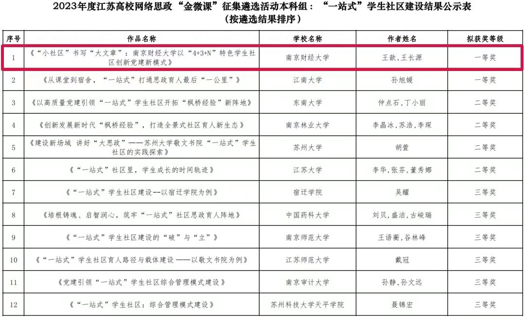 近日,2023年度江苏省高校网络思政“金微课”征集评选活动获奖名单公布,bat365报送的作品《“小社区”书写“大文章”:bat365官方网站以“4+3+N”特色学生社区创新党建新模式》(作者:王歆、王长源)喜获本科组一等奖第一名。