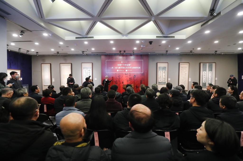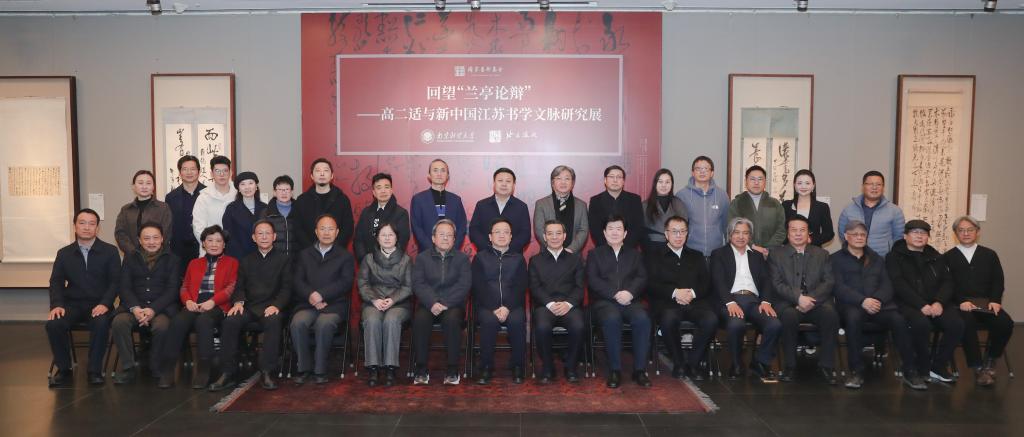 开幕式结束后,与会领导嘉宾集体合影留念,并与现场观众一起于美术馆一层和二层展厅,认真观看“回望‘兰亭论辩’——高二适与新中国江苏书学文脉研究展”的近90件展品。其中包括高二适先生书法精品和“兰亭论辩”相关文献等近70件,以及受其书风影响的当代江苏书法家作品10余件。此外,展览还精选了章士钊、马一浮、胡小石、林散之、苏渊雷、陶白、赖少其等老一辈艺术家与高二适的唱和作品近10件,展现出传统文士间心胸坦荡、刚正谨严的文化交流与承传。