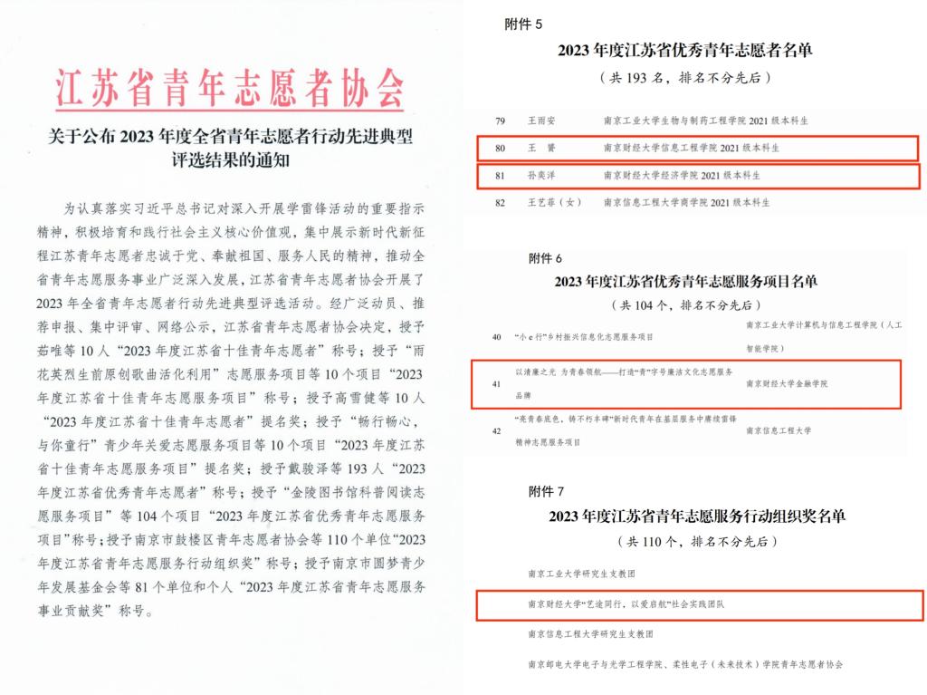 日前,共青团江苏省委、江苏省青年志愿者协会开展了2023年度全省青年志愿者行动先进典型评选工作。bat365在此次评选中获多项荣誉,其中,信息工程学院大数据2101班王贇、经济学院数统2101班孙奕洋获评“2023年度江苏省优秀青年志愿者”;金融学院“以清廉之光 为青春领航——打造‘青’字号廉洁文化志愿服务品牌”志愿服务项目获评“江苏省优秀青年志愿服务项目”;艺术设计学院“艺途同行,以爱启航”社会实践团队获“江苏省青年志愿服务行动组织奖”。