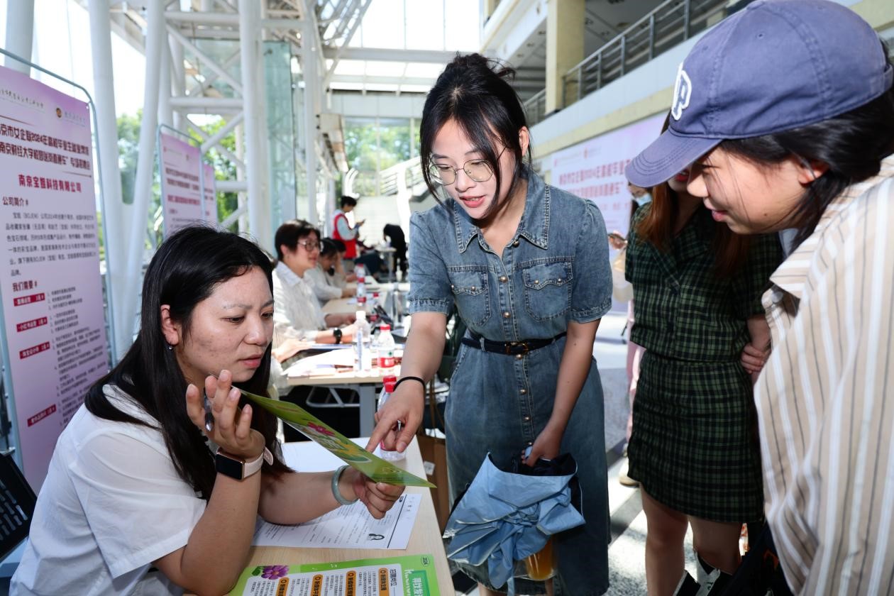 据悉,南京市民营女企业家联合会于2017年12月成立,发展至今已有300余家会员,始终围绕党政工作大局,以学习促引领,搭平台促交流,被全国工商联评为“四好商会(五星级商会)”,是南京市最具活力和影响力的社会组织之一。本次招聘会邀请到南京仁福珠宝首饰设计制作有限公司、A.O.史密斯(中国)水系统有限公司、天笑投资集团有限公司、南京瀚波新能源科技有限公司等20余家南京市女企联会员单位参会,涉及文化、金融、电子、服务业等多个行业领域,为bat365毕业生提供多样就业选择。招聘会现场设置了勤学励志就业帮扶、团团微就业等咨询台,为毕业生提供就业政策咨询、生涯规划、简历指导等服务。