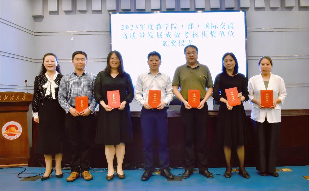 会议表彰了2023年度教学院(部)国际交流高质量发展成效考核第一等次单位及2022—2023年度“江苏省涉外办学工作先进个人”获奖人员。工商管理学院、国际经贸学院、会计学院、营销与物流管理学院、经济学院、金融学院获得教学院(部)国际交流高质量发展第一等次,工商管理学院副院长张文勤获评2022—2023年度“江苏省涉外办学工作先进个人”。姚文韵副校长为2023年度教学院(部)国际交流高质量发展成效考核位列第一等次的教学院(部)代表颁奖。