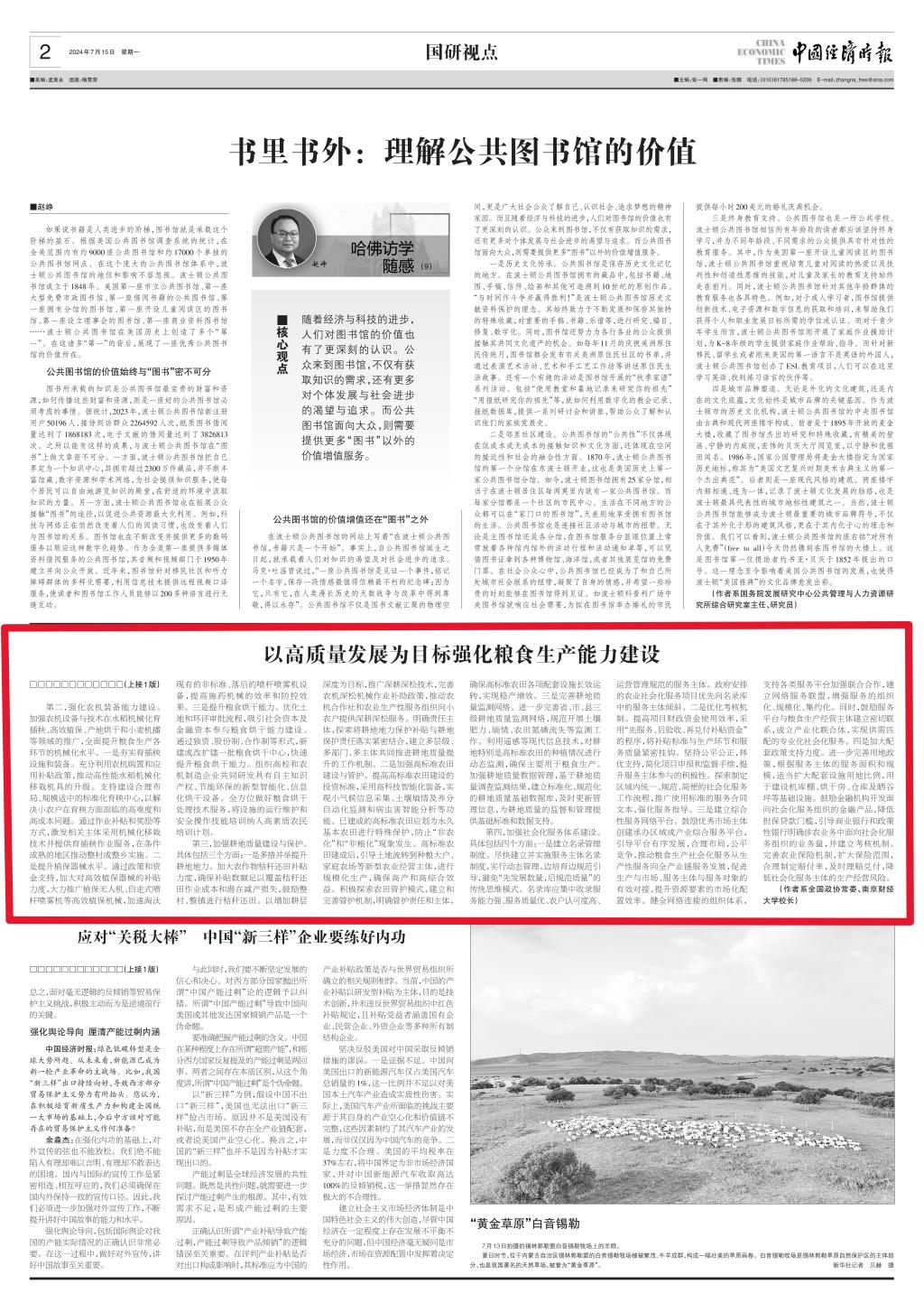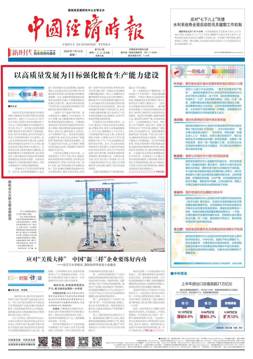 7月15日,《中国经济时报》头版刊发了全国政协常委、校长程永波的署名文章《以高质量发展为目标强化粮食生产能力建设》。