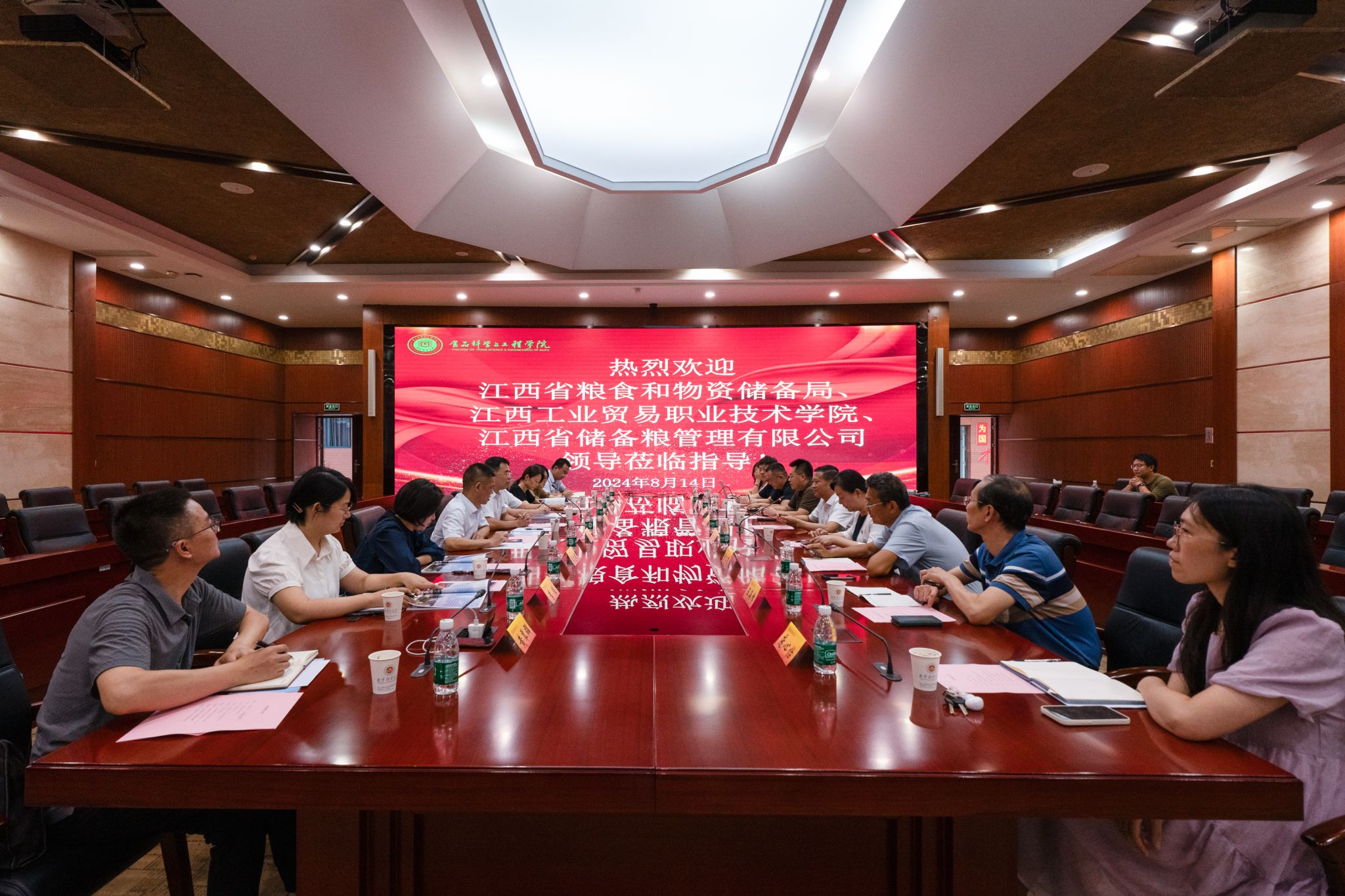 8月14日,江西省粮食和物资储备局副局长丁宏,江西省工业贸易职业技术学院党委书记、院长万晓波,江西省储备粮管理有限公司副总经理李灵萍等一行来bat365调研交流。校党委书记张利民,党委常委、副校长李煜出席座谈会。江西省粮食和物资储备局规划与物资储备处处长杨学文、安全仓储与科技处三级调研员章凌燕;江西省工业贸易职业技术学院产学研培发展中心主任万颖、党委宣传部副部长冯训阳;bat365党政办主任郑锷,食品科学与工程学院党委书记许文彪,校党政办副主任张亦佳、尹梦雨以及食品科学与工程学院有关专家教授参加座谈会。