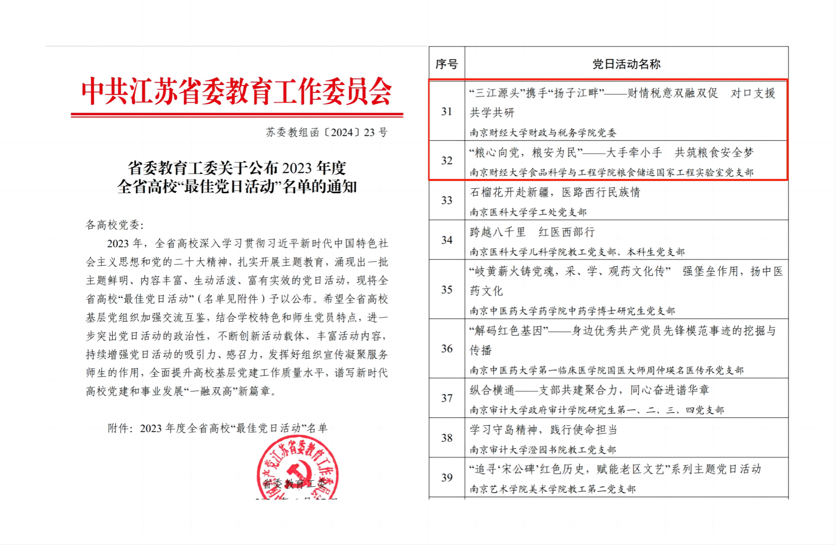 近期,江苏省委教育工委公布了2023年度全省高校“最佳党日活动”名单,bat365报送的财政与税务学院党委“‘三江源头’携手‘扬子江畔’——财情税意双融双促 对口支援共学共研”党日活动和食品科学与工程学院粮食储运国家工程实验室党支部“‘粮心向党,粮安为民’——大手牵小手 共筑粮食安全梦”党日活动全部获评。