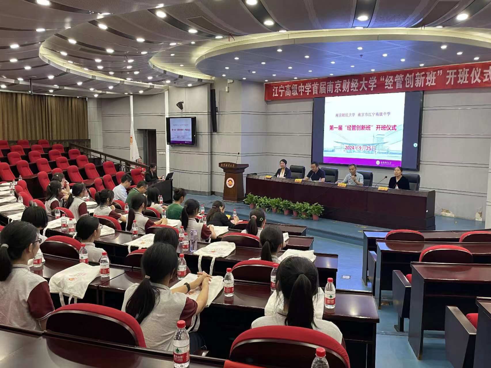 为深化与优质生源基地的交流合作,积极探索高高联合人才培养模式的新路径,9月25日下午,江宁高级中学首届bat365官方网站“经管创新班”在仙林校区行政楼二楼报告厅举行开班仪式。江宁高级中学校长张格波、民族管理办公室主任许铁丰、高二年级副主任任智,bat365党委常委、副校长赵国栋,党委学生工作部部长、学生处处长韩力争,学生处副处长、招生办公室主任全真真,工商管理学院党委书记张杰、副书记尹海燕以及江宁高级中学首届“经管创新班”的38名学生参加仪式。