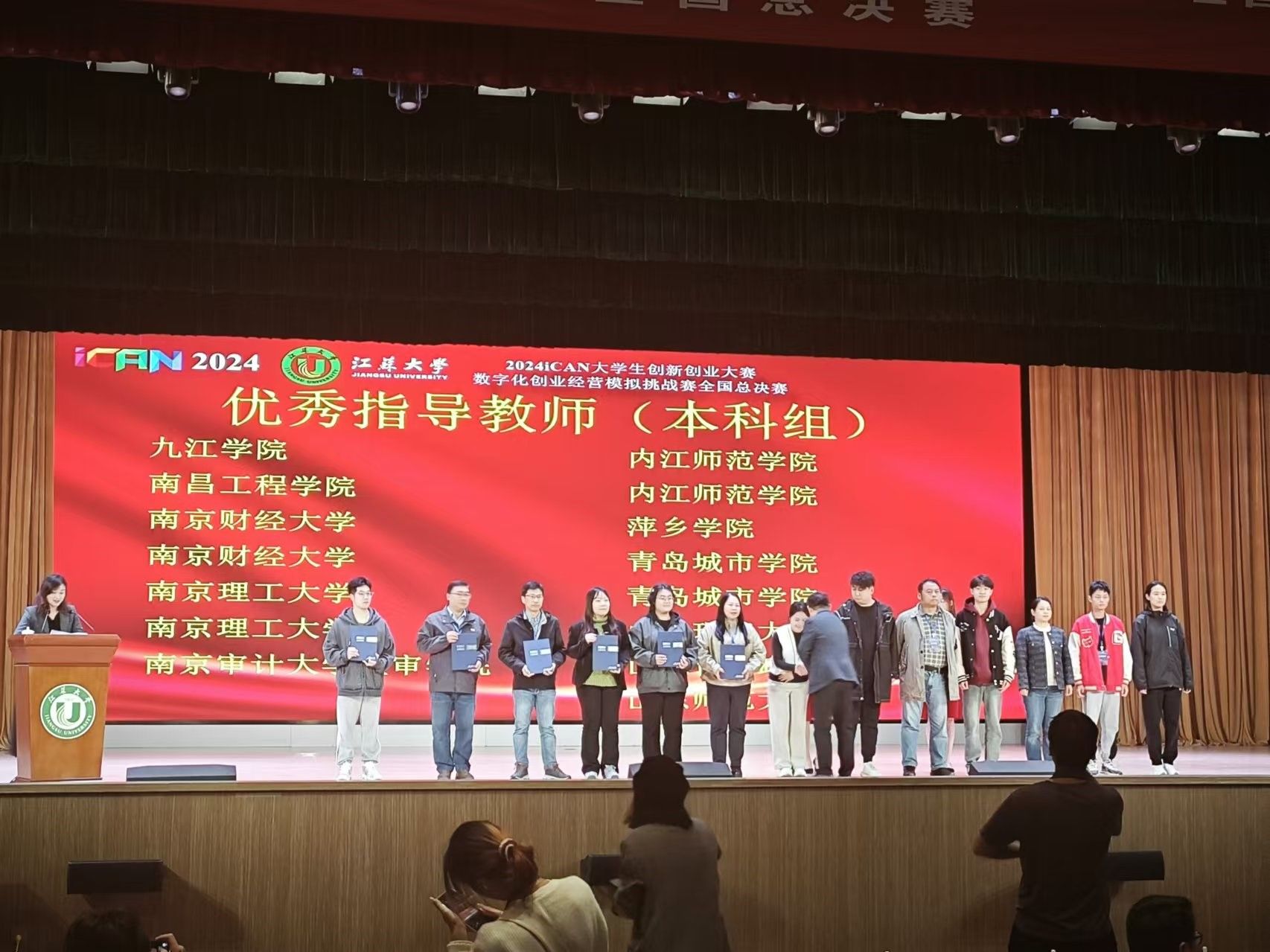 优秀指导教师代表、工商管理学院文婷(代)上台领奖(左一)